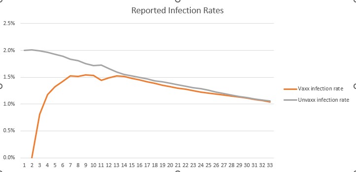 The result is while you do get an artificial efficacy in the first 10 weeks or so this rapidly settles down so the infection rates for vaxx and unvaxx are almost identical. I will try to bring this to Professor Fenton’s attention.