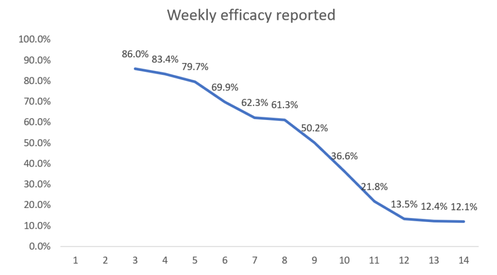 To calculate the week n efficacy rate we divide the vaccinated infection rate by the unvaccinated infection rate and subtract this from 1, expressing the result as a percentage. Hence, the week 4 efficacy rate is 1 – (0.37÷2.22) = 0.834 = 83.4%.