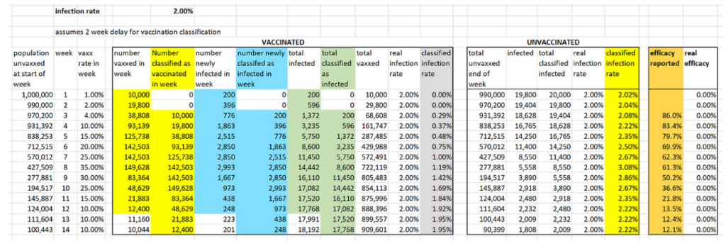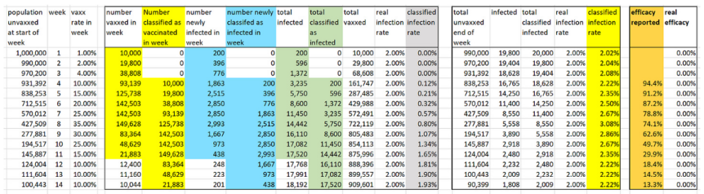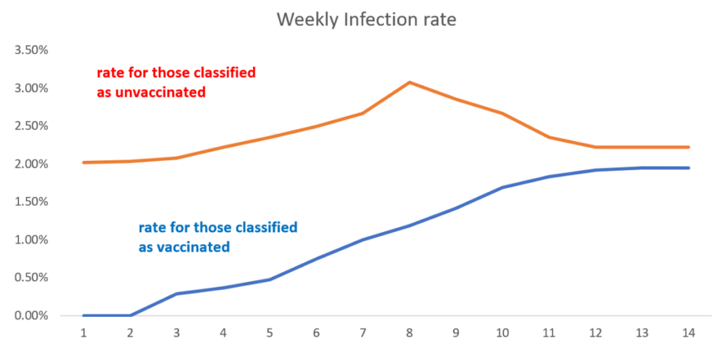 For example, by end of week 4 a total of 161,147 people have been classified as vaccinated, of whom a total of 596 have been classified as infected. So the week 4 infection rate for the vaccinated is 596/161,147 which is 0.37%. We do the same for those classified as unvaccinated, so the week 4 infection rate for the unvaccinated is 2.22%. Note that, although the real weekly infection rates of the vaccinated and unvaccinated are always the same 2%, the infection rates after the ‘classification’ are always lower than 2% for those classified as ‘vaccinated’ and higher than 2% for those classified as ‘unvaccinated’.