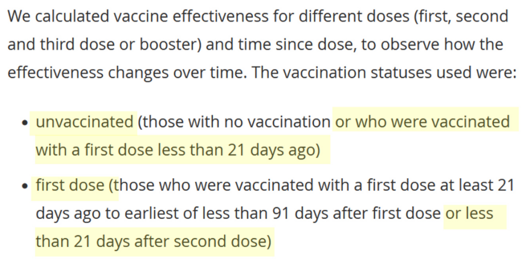 By using the 21-day period before considering a person vaccinated – as the ONS and others do for the Covid vaccines – means fraudulently high artificial efficacy rates are guaranteed. The apparent but completely artificial ‘waning’ of efficacy can also be used deviously to support the idea that after three or four months another dose of the vaccine is required to regain protection. Since the same delay in classification is used for those who have received a further dose, it is then guaranteed that high efficacy can again be claimed for the subsequent doses.