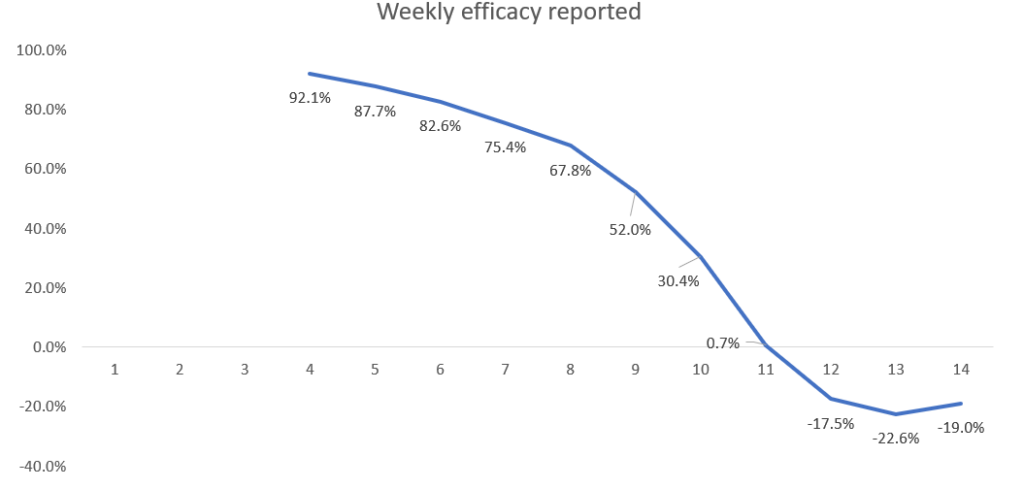 Note that for a placebo vaccine it is impossible to get negative efficacy. However, if there is a slightly higher infection rate for the vaccine compared to no vaccine then the same assumptions as above still yield high efficacy initially (92% at week 4) before eventually becoming negative. Here are the results if the vaccine actually increases the infection rate by 50% (so a 3% infection rate in the vaccinated rather than the assumed 2% in the above simulations).