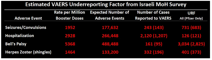 But we don’t really need to guess about this stuff as many governments carry out active monitoring via surveys of vaccinated people. The Israeli Government’s survey, for instance, found that 0.3% of vaccinated people (1 in 333) reported being hospitalised as a result of their first Covid booster, while a U.S. CDC survey found 0.9% of vaccinated people (1 in 111) reported seeking medical care as a result of their vaccination. A vaccine monitoring app in Germany found that 0.3% of vaccine recipients reported at least one serious adverse reaction to the first dose of the vaccine. The MHRA has never published the U.K. version of these data. A comparison of the Israeli active monitoring rate (from the survey) to the passive monitoring rate (from VAERS) showed that the true number of people hospitalised following their vaccination was 126 times higher than the number who reported it to VAERS, i.e., less than 1% of those who according to the survey were hospitalised following their vaccine reported it to VAERS. Other under-reporting rates in the Israeli survey (see examples in table below) were even higher, making Bridgen’s (and the MHRA’s) 10% estimate look very conservative. Note that these figures don’t have a control group for comparison to allow for incidental events.
