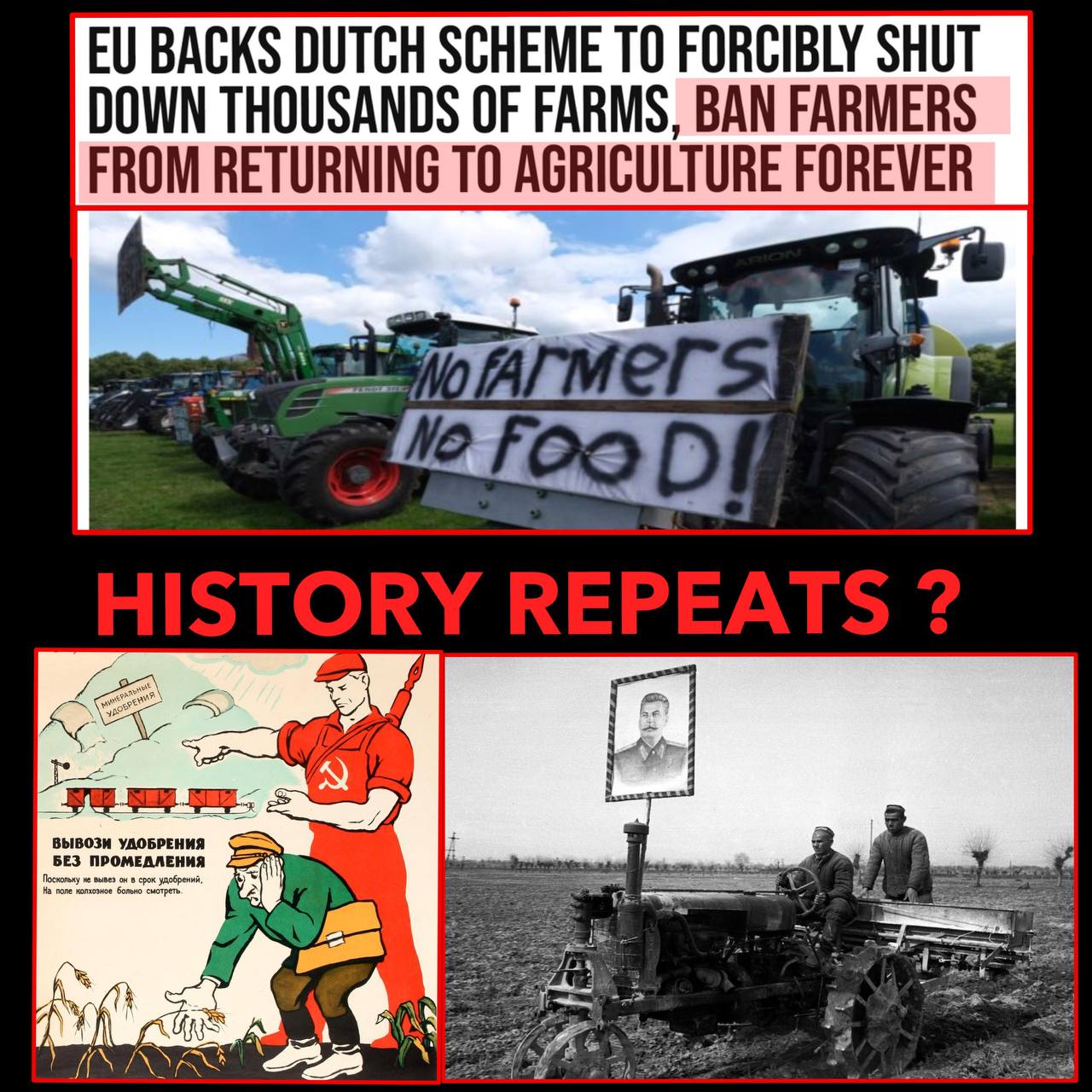 My take is that it’s only gone partway towards the depopulation & control agenda, they need to implement the next part. The closure of farms in the Netherlands – salad bowl of Europe – will cause problems with supply of fresh, high quality food. Solution will be processed unhealthy pap or starve. The text below compares the current agenda with that of Stalin’s & we all know the outcome of preventing farmers from farming was back then.