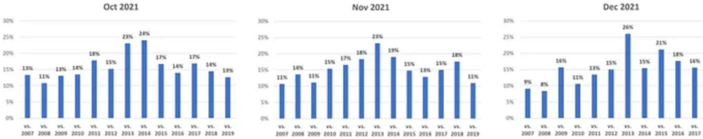 Avoiding any modelling, I simply compared the number of deaths in each month of the last quarter of 2021 with the corresponding month of every year between 2007 and 2019 and computed the excess (%).