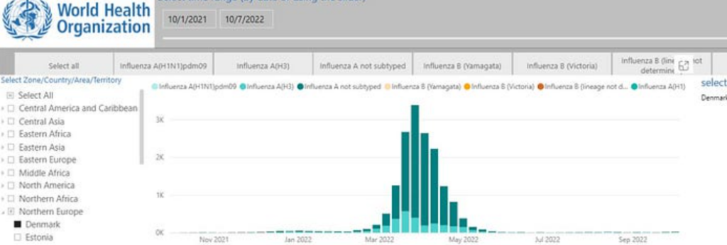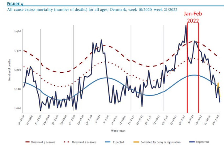 Indeed, flu returned only in March 2022 (figure below), so it is irrelevant to most of the period in question. It cannot account for excess mortality any time earlier. Which other major public health event was there in Denmark during the winter of 2021–2022 besides a major Covid wave? The authors offer no explicit answer.