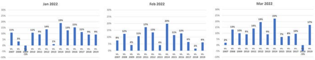 Excess mortality was lower at the beginning of 2022, but it was at least 5% in most comparisons with previous years, as shown below. (The comparisons with February and March 2018 are compromised due to a severe flu wave back then. See figure here.)