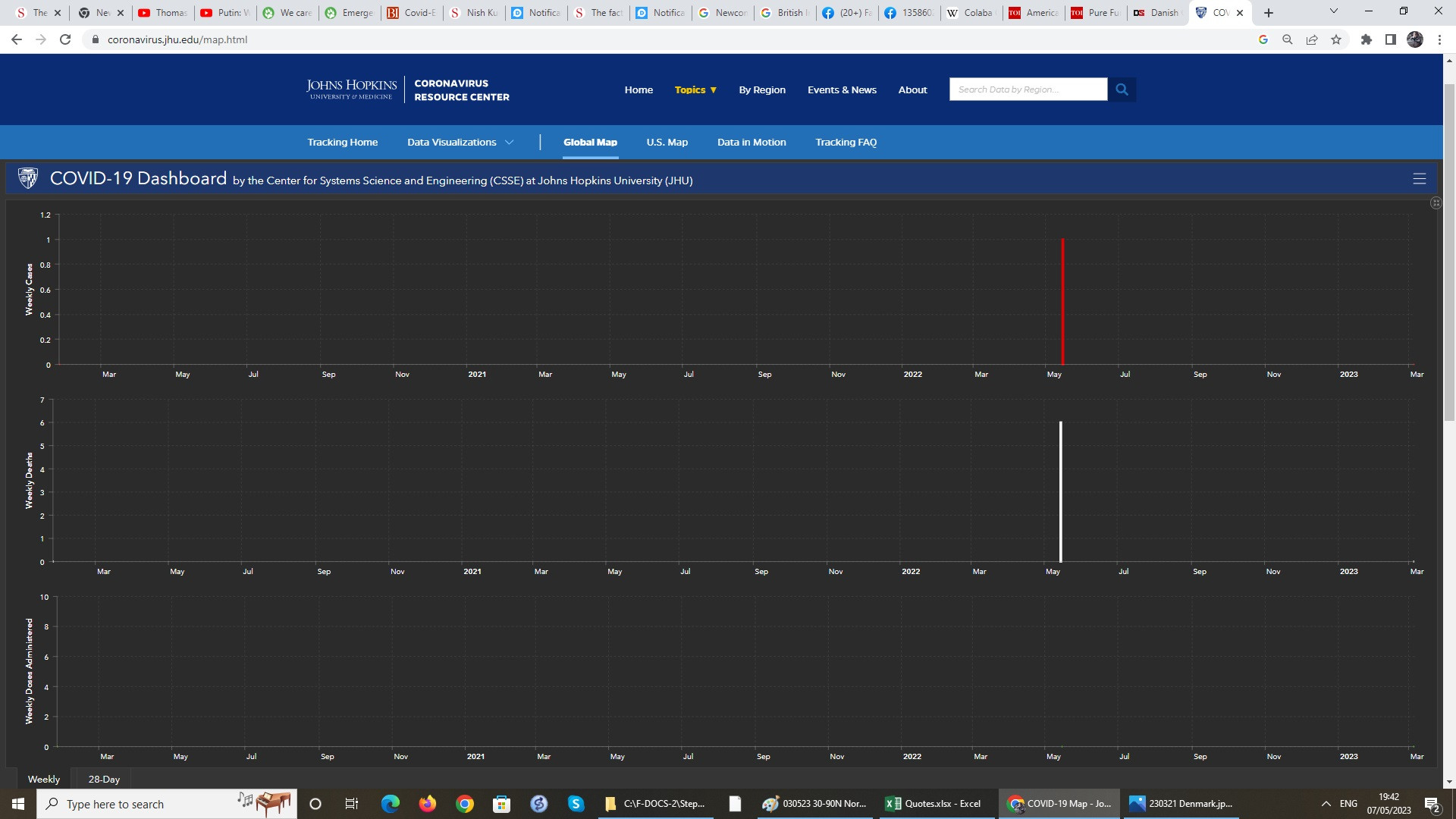 I have posted this before, but please see the graphs below from the Johns Hopkins Coronavirus Resource Centre. This shows cases (red), deaths (white) and vaccine doses (green). The graph originally showed vaccine doses as accumulative, which would be correct as the effects of these vaccines would be long term. But then Johns Hopkins changed the graph to show weekly totals. The winter waves of deaths is quite clear as well as the almost disappearance of illness during the summer months. After the 2nd wave the vaccine roll out gets into swing and then the 3rd wave is the biggest of all. It looks like there is another wave of vaccinations just prior to the 3rd peak which also didn’t top out until March. What is also of interest is that more deaths than usual continued through the summer months which is usually the time all respiratory infections fade away.