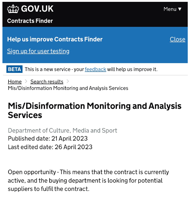 This is revealed in a notice posted on the Government’s Contracts Finder site that contains information about contracts whose value exceeds the equivalent of $15,000. It shows the authorities are looking for a “misinformation and disinformation monitoring and analysis service”.