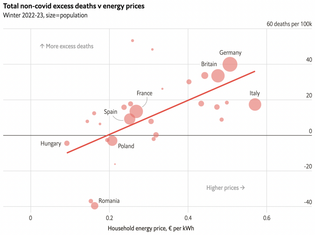 The Economist ran a model controlling for various factors, and found that “a price rise of around €0.10 per kwh” was associated with “an increase in a country’s weekly mortality of around 2.2%”. Which implies that if energy prices had not risen, there would have been 68,000 fewer deaths in Europe.