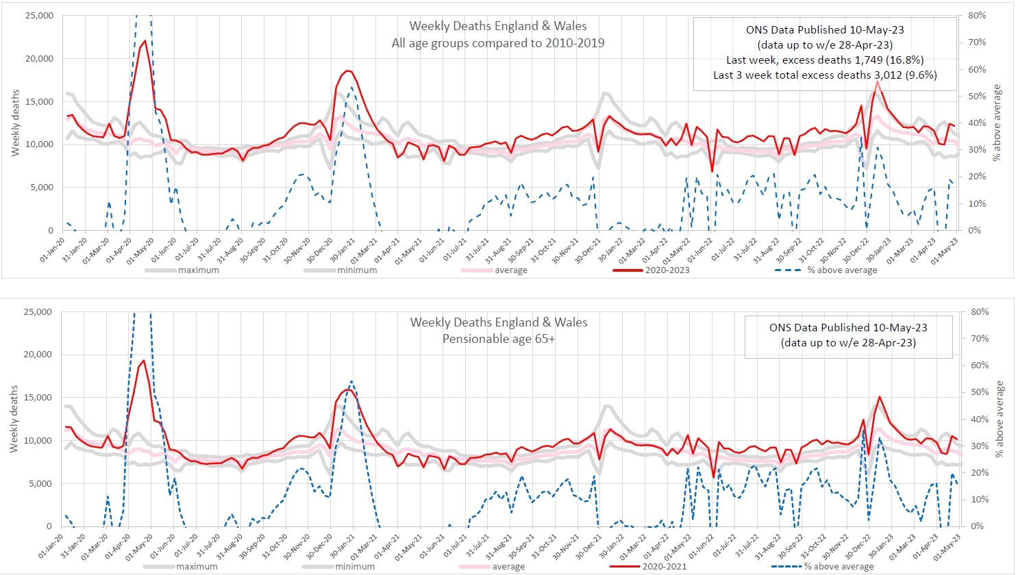 How do the excess deaths look from, say, May 2022 to May 2023? Fairly consistent, I would say – for both charts.
