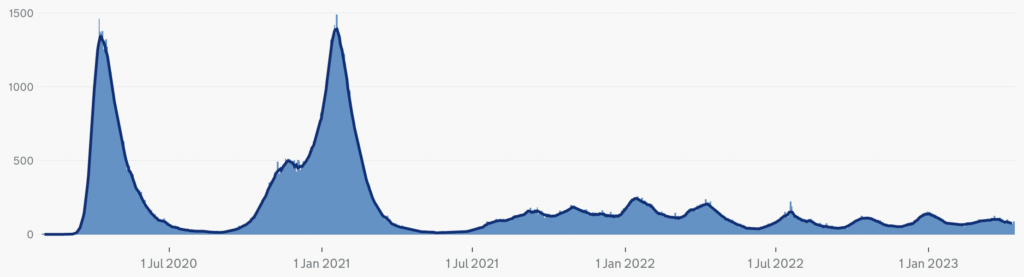 The chart below shows the number of daily deaths with “COVID-19 on the death certificate” in the U.K., since March of 2020. There are, of course, various problems with this chart – as readers are well aware. But I’m showing it because it’s the chart with which members of the public will be most familiar.