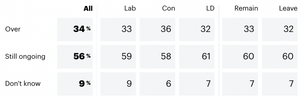 Interestingly, the poll found no real differences by political views: Conservatives were as likely to say “Sill ongoing” as Labour voters; Leavers were as likely to say “still ongoing” as Remainers. One variable that did seem to matter was age: over 65s were much more likely to say “Still ongoing” than 18–24 years – a majority of whom said “Over”.