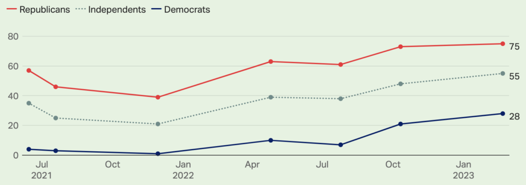 If we look across the pond, a recent Gallup poll found that 49% of Americans believe the pandemic is over – which is 15 percentage points more than in Britain. (Some fraction of Americans will presumably have answered “Don’t know”, so those who believe it’s not over must be in the minority.)