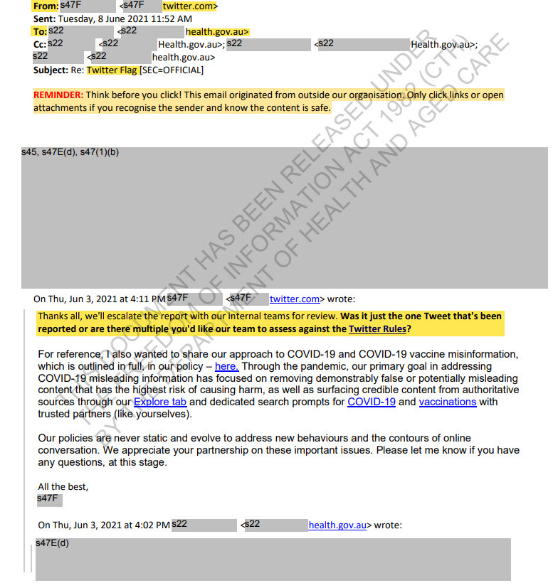 The documents show that the DOH also emailed Twitter and Instagram to flag social media posts, including one that directly quoted the TGA’s Covid vaccine safety report. Twitter emailed back asking the DOH if there were any other Tweets that it would like the Twitter team to assess.