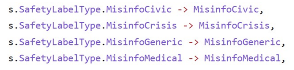 They are “safety labels” that have been included in the algorithm to restrict the visibility of alleged ‘misinformation’. Furthermore – leaving aside the handy ‘generic minsinfo’ catch-all – the general categories of ‘misinformation’ used exactly mirror the main areas of concern targeted by the EU in its efforts to ‘regulate’ online speech: ‘medical misinfo’ in the context of the COVID-19 pandemic, ‘civic misinfo’ in the context of issues of electoral integrity, and ‘crisis misinfo’ in the context of the war in Ukraine.