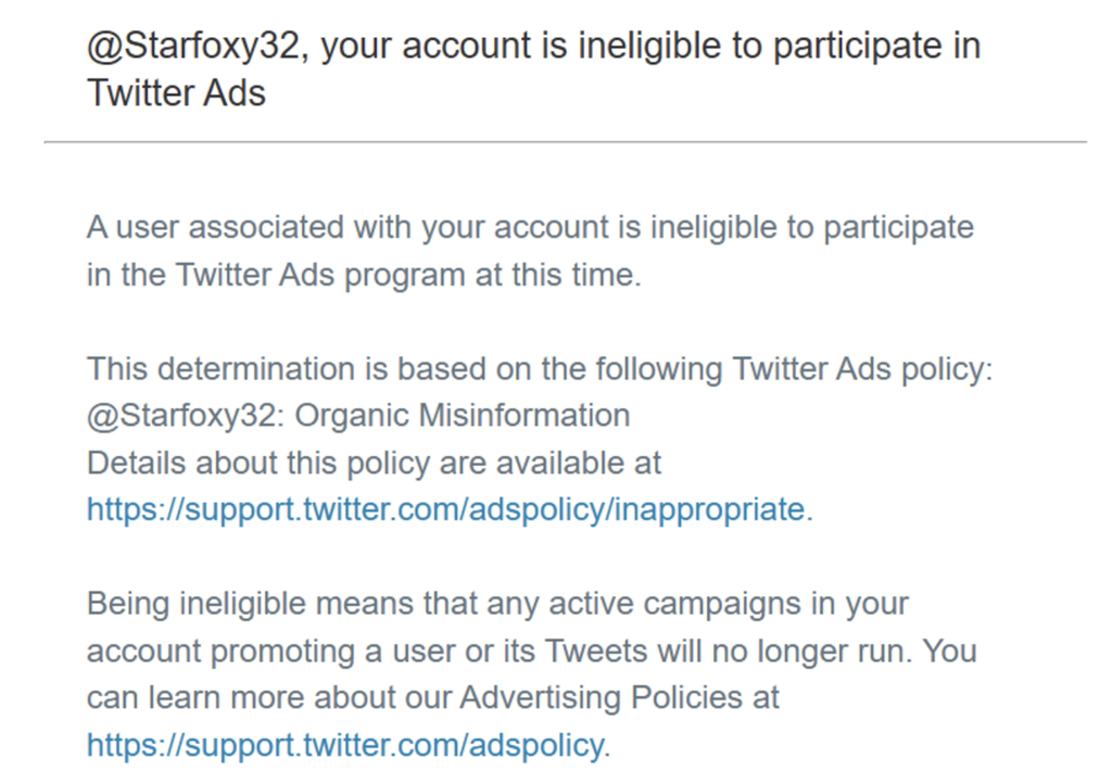 Finally, what is the below notice, which many Twitter users recently received informing them that they are not eligible to participate in Twitter Ads because their account as such has been labelled “organic misinformation”?