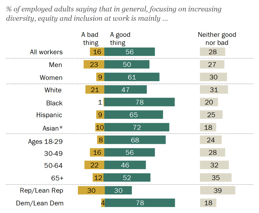 The first thing to say is that the question itself was quite vague: “Do you think that focusing on increasing diversity, equity and inclusion at work is mainly a good thing or a bad thing?” And it’s possible that some respondents just didn’t put two and two together. They thought “those things sound good”, without realising what “increasing diversity, equity and inclusion” actually entails.