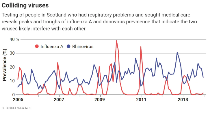 The Science article also cites a 2020 Lancet study that found that out of 1,911 samples positive for rhinovirus or influenza A virus, only 12 had both viruses.