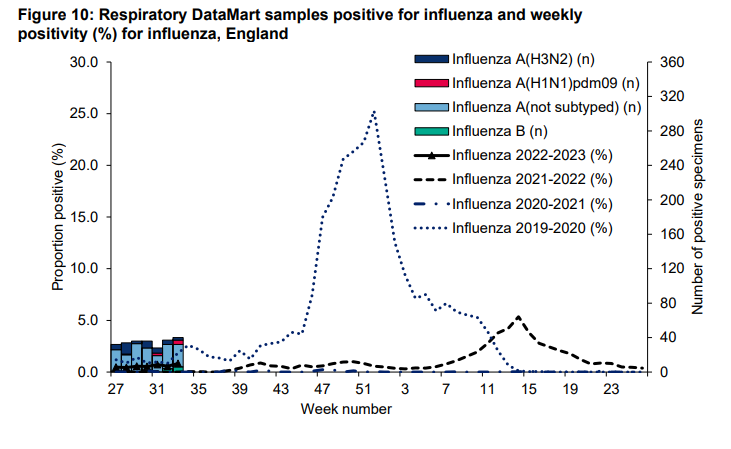 Their articles examine a number of data sources. However, a key one missed out is the “Respiratory DataMart weekly positivity for influenza” found in the ‘Weekly national Influenza and COVID-19 surveillance report‘ from the UKHSA. The following chart is from August 2022 (p12).