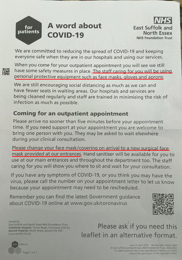 In contrast, just 40 miles away from Basildon, in Colchester General Hospital, things are different. Part of the East Suffolk and North Essex NHS Foundation Trust (ESNEFT), the spectre of face masks continues to lurk ominously. The home page of the parent trustâs website, on the frame advertising âLatest Visiting Informationâ, continues to display a prominent photo of a masked nurse. Regarding guidance for visiting the hospital, the general message is that COVID-19 is still âa thingâ, the web page headline stating that, “We continue to care for patients with a number of transmissible infections”. Further, visitors are told that they are “required to wear surgical face masks covering their nose and mouth where there is a high-risk of transmission of contagious respiratory infection”. In addition to a list of specific conditions and scenarios in which masks should be worn, the instructions are that those attending A&E will be “asked to wear a surgical mask”. Masks are available at all hospital entrances or by asking staff for one.
