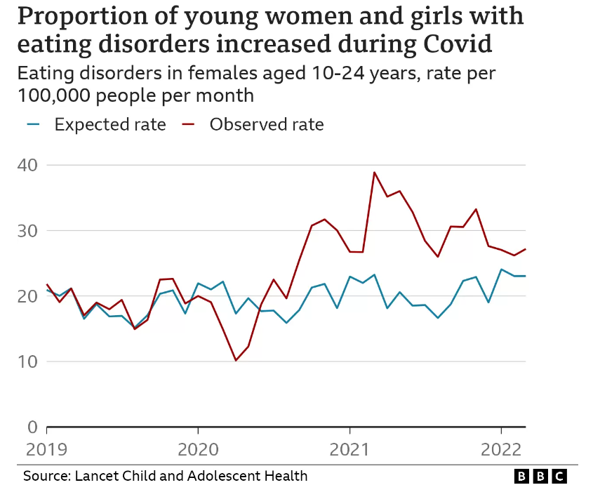 Over that period, around 2,700 diagnoses of eating disorders were anticipated among 13-16-year-olds, but 3,862 were actually observed – 42% more than the expected figure.