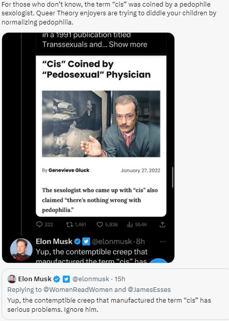 Oh Elon you silly man, “cis” is not slur, it’s a word invented to cement the pretence that the choice between remaining physically intact as a male or female and self mutilation is somehow normal, like deciding which football team to support. Censoring it will do nothing but harm. Let the evil loonies speak and show us their true colours.