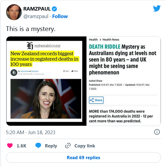 It’s either the vaxx or Covid. Either way we’ve been lied to. Why couldn’t it be Covid? What explanation do the authorities have for it not being Covid? They simply stopped looking for it and counting it. The whole thing has been political theatre. So I think the question is perfectly legitimate.