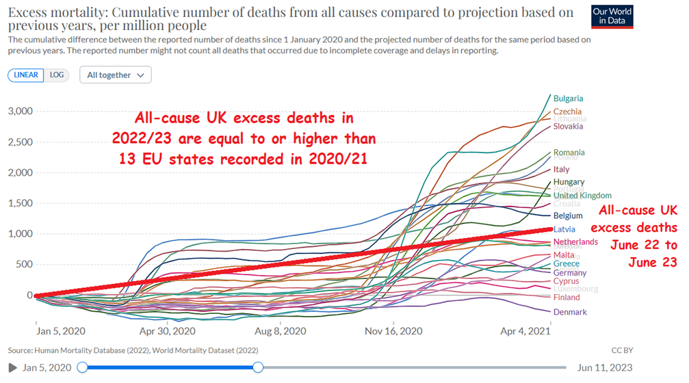 Figure 1 shows all-cause excess deaths across the EU for the period April 4th 2020 to April 5th 2021. I’ve overlaid the Our World in Data chart with a thick red line representing U.K. all-cause excess deaths from June 5th 2022 to June 4th 2023. You can see that U.K. deaths in 2022-23 would have ranked ‘mid-table’ among EU countries in 2020-21.