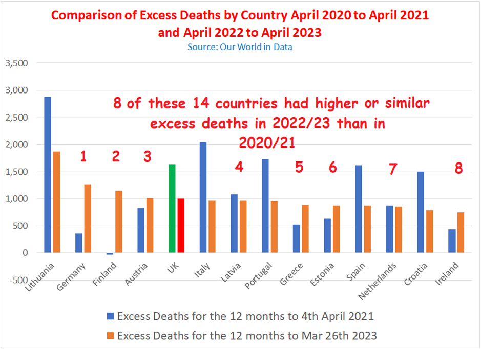 But the fun doesn’t end there. Figure 2 picks out the U.K. and 13 EU countries with excess all-cause deaths in the 12 months to April 2023 (the latest date for which figure were available for all countries) greater than 750 per million. Back in 2020-21 this level of excess deaths would have put you mid-table in the EU excess death league. Clearly, in 2020-21 it was considered essential to lock down populations with these modest levels of excess death (or indeed, lower).