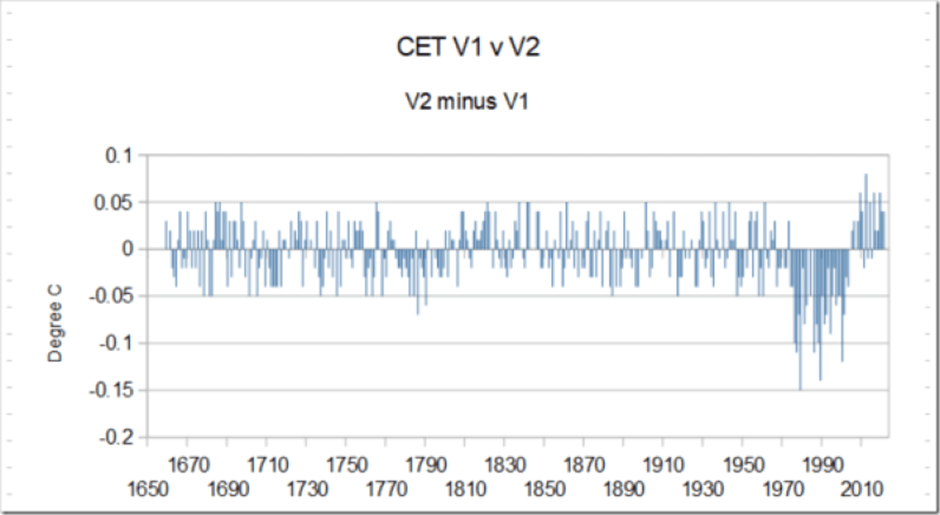 The graph above plots the changes from the two versions. The cynical might note that the 1980s and 90s were strangely ‘overestimated’, while the last couple of decades were suddenly underestimated, for reasons that go unexplained. One effect noted by Homewood is that a 0.07°C cooling of the summer in 1995 now means it ties with 2022, instead of being hotter. In 2018, the summer was adjusted up by 0.13°C. Homewood concludes with the obvious point that changes to the CET are part of wider adjustments globally, “and the tampering is always one way, cooling the past and heating the present”.