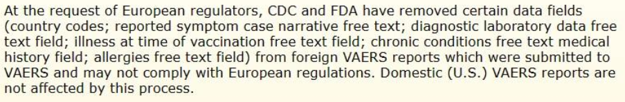 Why then would they not be listed as such? Well, it will be recalled that last November, on the request of ‘European regulators’, VAERS was purged of EU data. The purged data includes precisely the country codes. See the below notice, which comes directly from the CDC website.