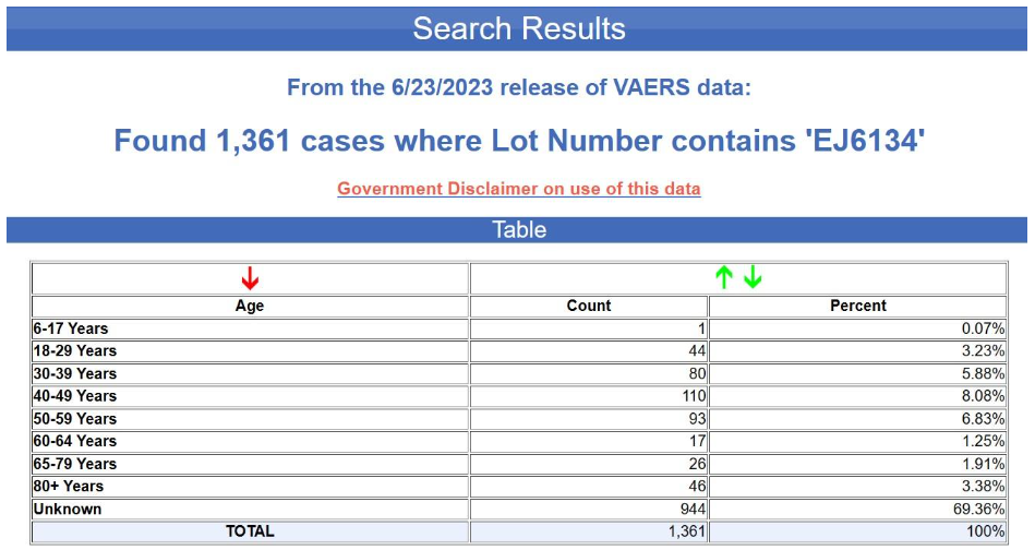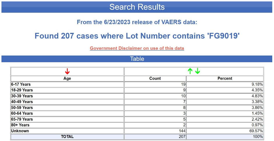 But even supposing that this bias were corrected by including more lots or using more comparable lots, the more fundamental problem here is again the extremely fragmentary character of the data. In fact, the age of the recipient is not even indicated in the overwhelming majority of the reports in question. The tabular search results for the yellow batch (FG9019) are shown below. The age is unknown in nearly 70% of the cases.
