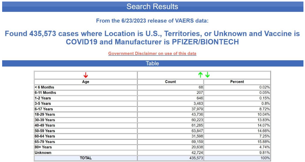 Yet again, the age is unknown in nearly 70% of the cases. This is not at all typical for VAERS, by the way. Below is the age distribution for all the adverse events reports for the Pfizer-BioNTech COVID-19 vaccine excluding the foreign reports i.e., for U.S. reports only.