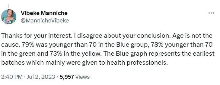 In any case, if one suspects that the batch variability in the Danish study is just a function of the ages of the vaccinees, why not ask the authors if they have relevant information? As it so happens, they do, and Vibeke Manniche, one of the authors, has addressed the issue in the below tweet reply to Denis Rancourt. The reality is exactly the opposite of what is suggested by the age-confounding hypothesis: more elderly people got the ‘safe’ yellow batches than the dangerous blue ones.