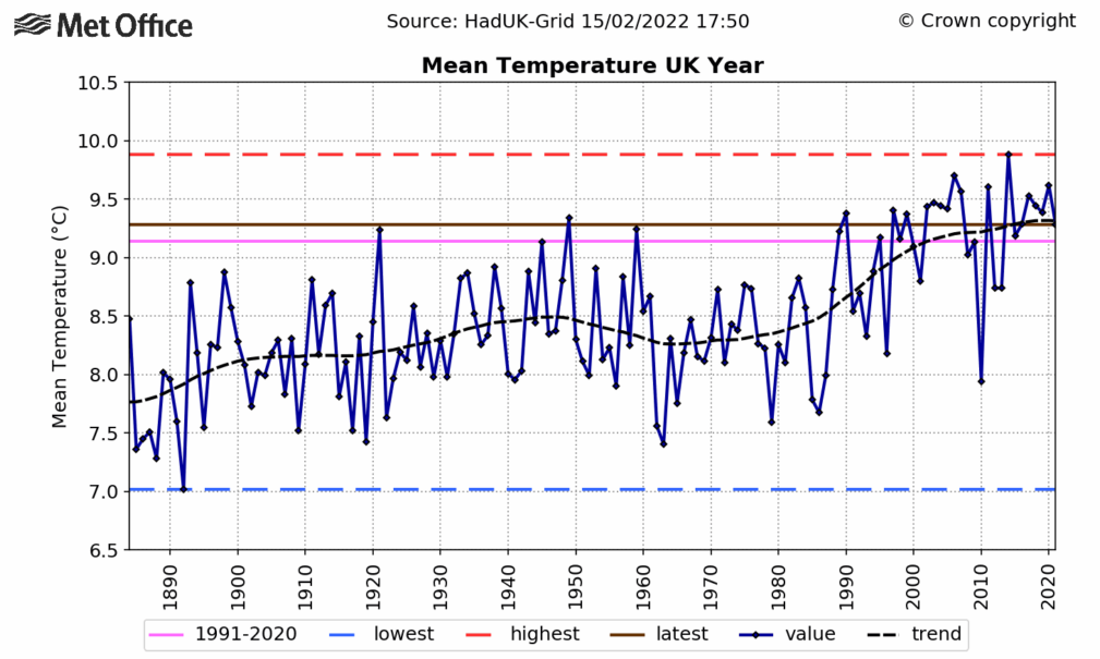 It appears that the Met Office are using a 10-year trailing moving average calculation for the trend line, so, given the sizeable jump from 2021’s to 2022’s values, it isn’t surprising that the trend values for all of the previous 9 years will have increased accordingly.