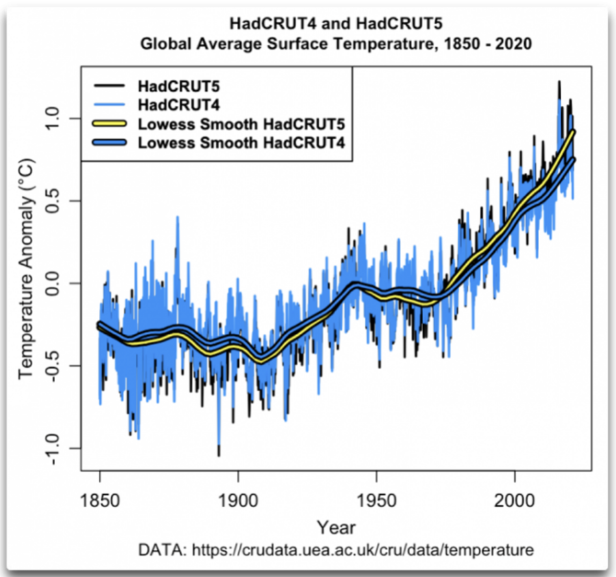 The graph above tracks the final demise of the pause from HadCRUT4 to HadCRUT5. The pause is still slightly evident in the earlier version, but finding an additional 0.1°C of heat finally airbrushed it from the official record. Along with the earlier addition of 0.1°C, it took 0.2°C of warming to finally kick it into touch. This significant warming, most welcomed of course in political Net Zero circles as fuel for their narrative, was also enhanced by the cooling of about 0.1°C applied before 1974. Of course, fans of the pause can still view it in the accurate satellite record, along with the current pause of almost nine years.