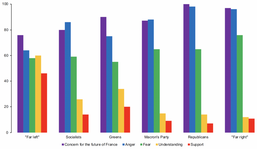 Interestingly, the only party where there is substantial support for the rioters is the ‘far Left’ – though even here, it amounts to less than half of voters. What’s also interesting is that Macron’s voters look very similar to Republican voters and those who vote ‘far Right’. All three groups show substantial anger, and none shows much understanding or support for the rioters.