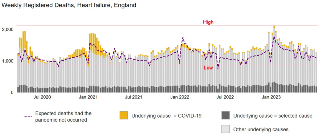 Figure 1 shows weekly deaths from heart failure since week 12 of 2020. You can see, with or without Covid linked deaths, there has been a significant and sustained increase.