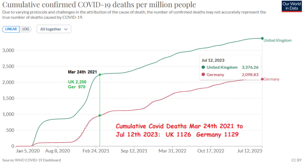 You can see that, as Mr. Gaer asserts, Covid deaths in Germany over the past three-and-a-half years are recorded as about 2,000 per million compared to the U.K.’s 3,376 per million. However, this variance is wholly due to the course of the pandemic from March 2020 to March 2021, by which point all the variance we see now had already occurred. Is he claiming that Germany’s relatively low number of deaths during the first year of the pandemic was wholly down to its treatment protocols, higher number of ICU beds and the organisation of its healthcare systems? If that’s the case, why did Germany’s Covid deaths match ours for the subsequent two-and-a-half years? Except for Sweden and Belarus, all European countries followed the same public health policies but with hugely variable outcomes, Finland saw one sixth of the Covid deaths that Germany did. Was this because Finland’s health service was superior to Germany’s? Of course not.
