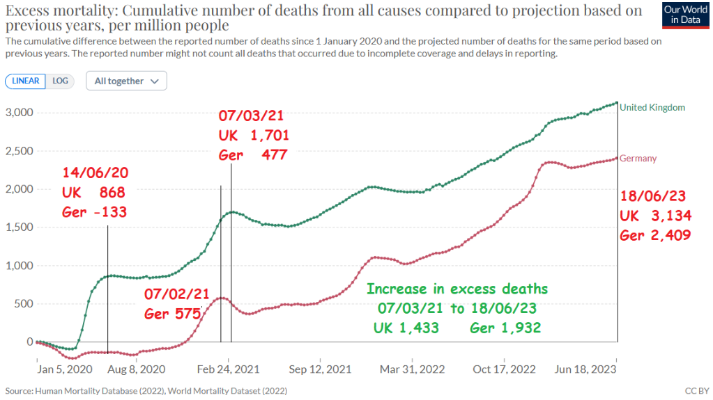 Rather than just looking at Covid deaths let’s look at all-cause excess deaths and compare the U.K. to Germany. Most experts agree that all-cause deaths is a far better measure of how a healthcare system works, rather than just the narrow focus on Covid deaths.