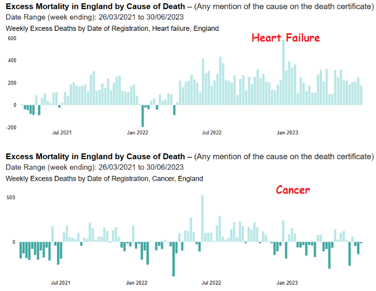 Figure 4 reproduces charts from the Office for Health Improvements and Disparities showing excess deaths from heart failure and cancer from week ending March 26th 2021 to the end of June 2023. Cancer deaths are tracking the expected rate while heart failure deaths are dramatically elevated.