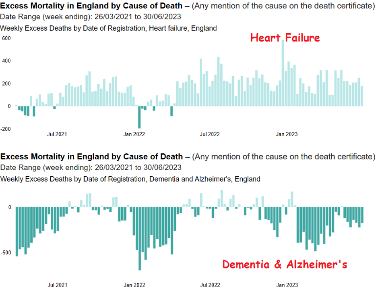 The Office for Health Improvement and Disparities has produced the data for England. They show that from week 12 to week 26 of 2020 there were expected to be 16,752 heart failure deaths. Whereas in 2023 from week 12 to week 26 17,825 deaths were expected. For some reason we expect 6% more people to die of heart failure now than we did three years ago, even more of a surprise when you consider that the ‘pandemic’ was supposed to have cut a swathe through the ‘dry tinder’! In the event 21,222 people died from heart failure in England during this period in 2023.