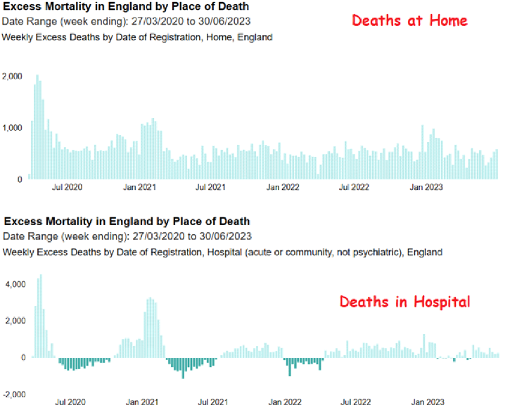 Figure 6 illustrates another issue that’s been too much ignored. Since the beginning of the pandemic, with the exception of the two short spikes in April of 2020 and January of 2021, excess deaths in hospitals haven’t been exceptional. However, excess deaths ‘at home’ shot up and have consistently stayed high.