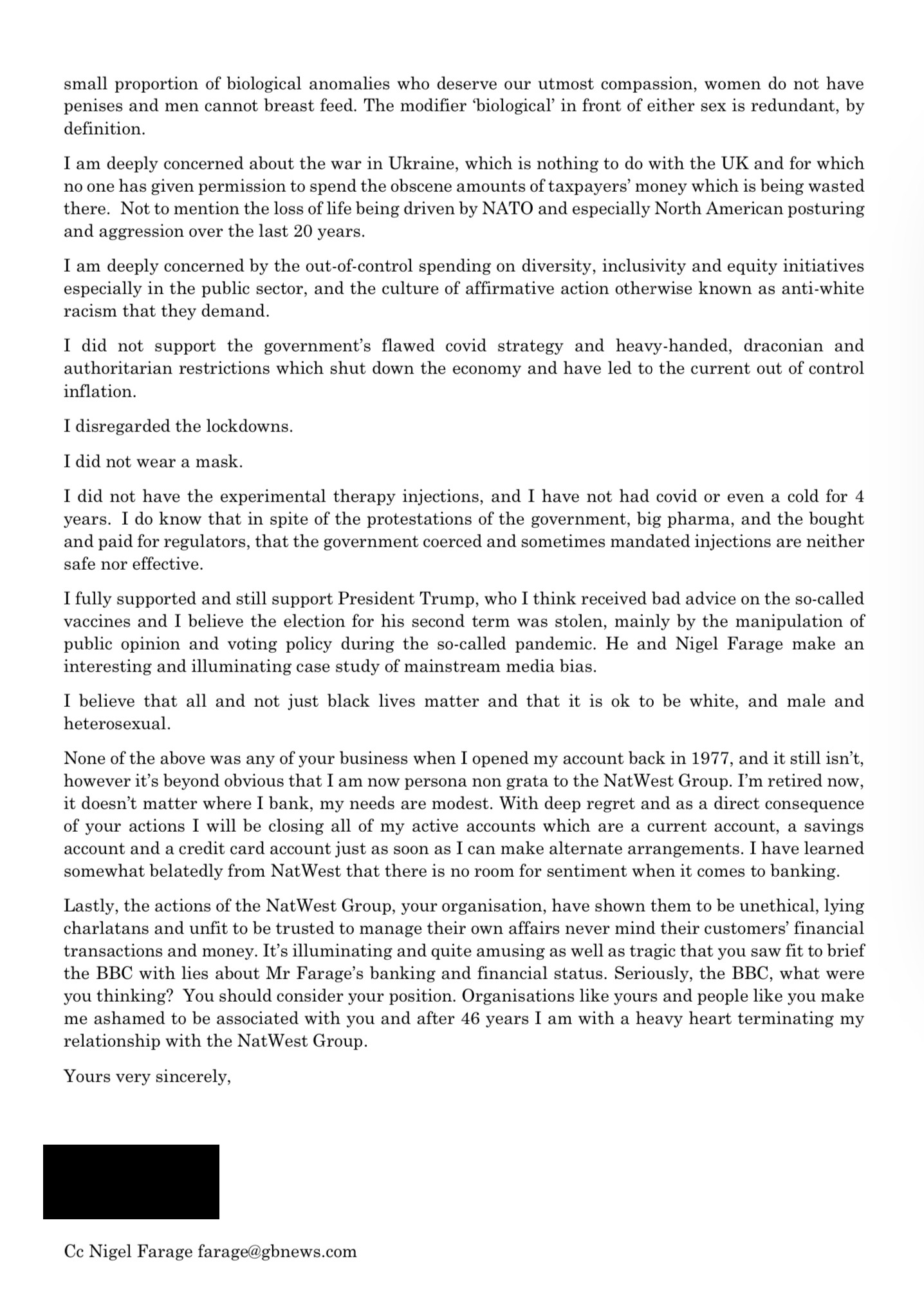 I am a NatWest Bank account holder. I sent the attached letter to Alison Rose, Chief Executive Officer of NatWest Group today. I know it’s only a gesture but it’s my gesture.