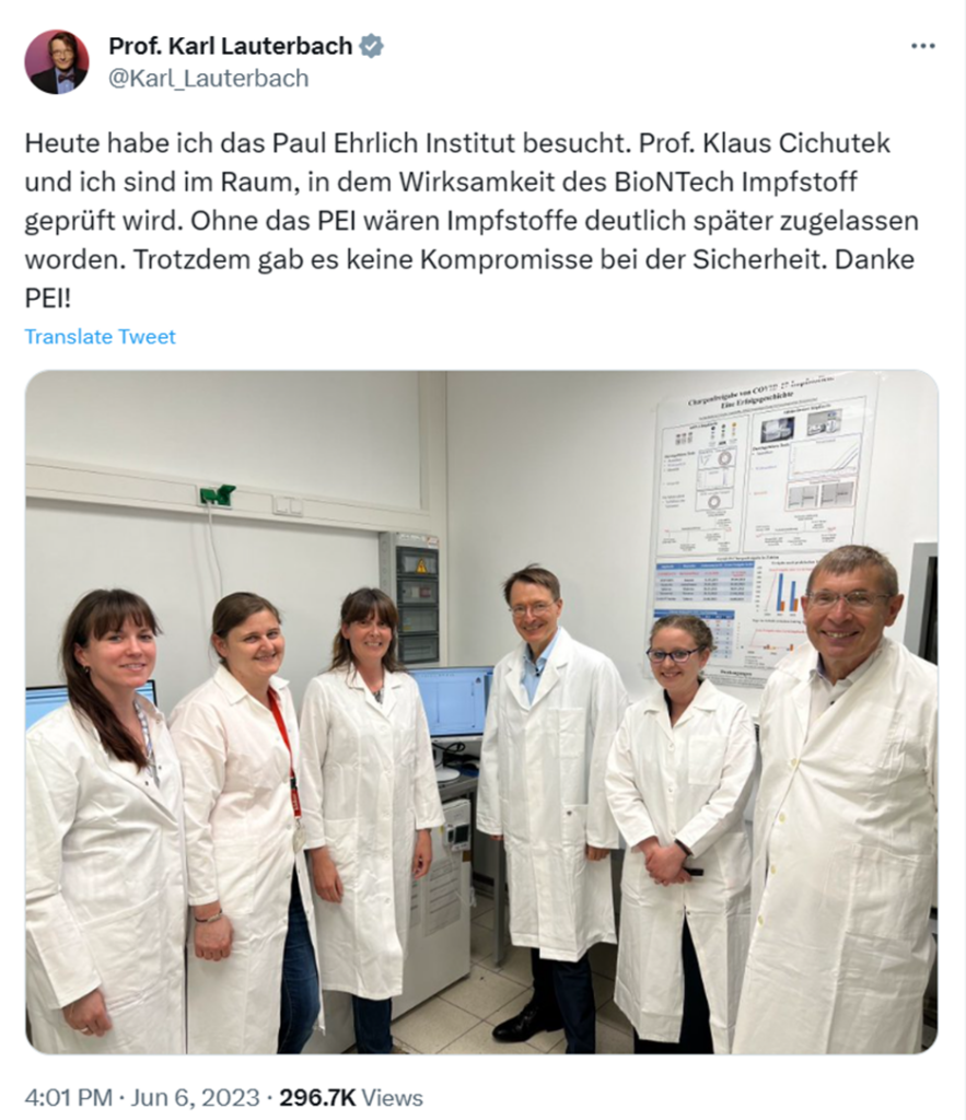 The slide consists simply of a tweet dated June 6th. The author of the tweet is none other than German Minister of Health Karl Lauterbach. The picture shows Lauterbach at the Paul Ehrlich Institute with PEI president Klaus Cichutek and some lab workers. Lauterbach is the man in the middle of the photo and Cichutek is to the right.