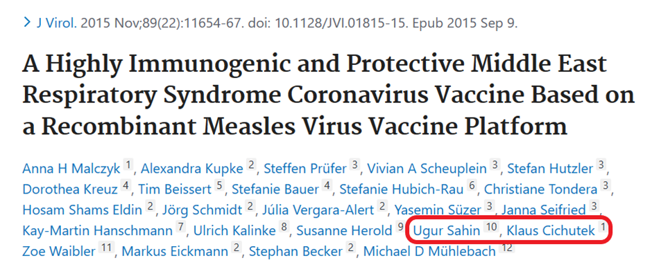 But it is not only that PEI staff have coauthored papers with Sahin and Türeci. As can be seen below, PEI President Cichutek has himself coauthored a 2015 paper – interestingly enough, on the development of a coronavirus vaccine! – with none other than BioNTech CEO Ugur Sahin.