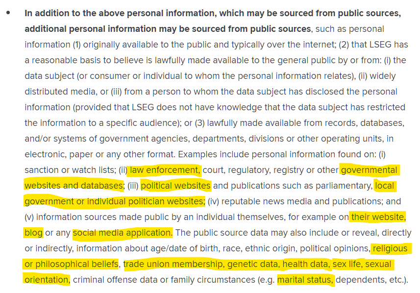 Perhaps they have covered themselves by referring to “publicly available” information. Of course that information may have been made public without the subject’s consent, but perhaps it would be up to the subject to pursue the original publisher, get it removed and then pursue Refinitiv. You could argue that Refinitiv could not reasonably be expected to establish whether every piece of already public information had been made public legitimately.