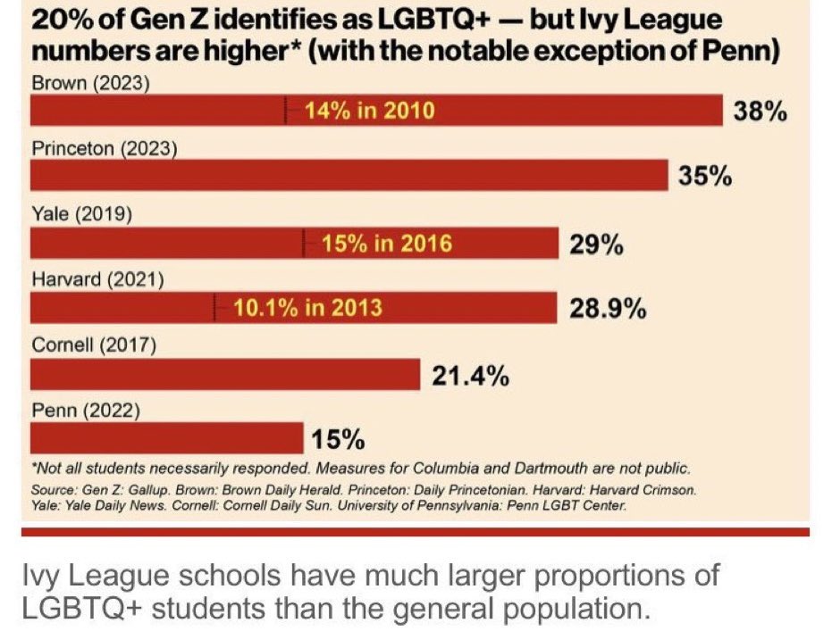 Stop Press: The percentage of students at Ivy League universities identifying as LGBTQ+ is way above average – with the exception of Penn. Is it an attempt to enhance social status by claiming victimhood points? Or do these colleges have an above average amount of oestrogenically active substances in their water supplies?