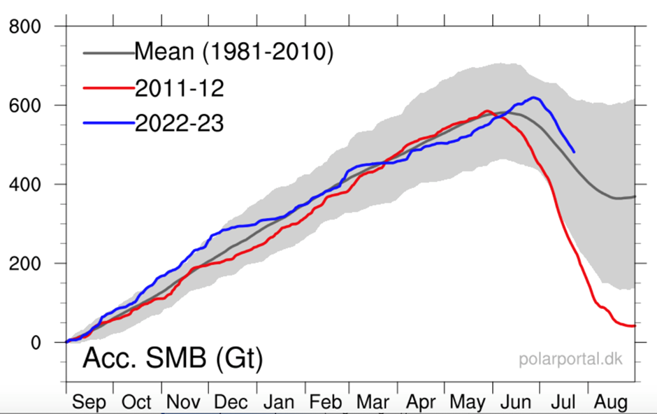 Almost halfway through the short summer, the accumulation of surface ice on Greenland is more than the 1981-2010 average and a big improvement on a decade ago. But the current improvement could be seen in a much better light. Why are the Danish Polar Portal compilers of the below graph using a 1981-2010 average, when data can be included up to 2020? The NSIDC uses a similar average comparison in its Arctic ice graphs. The Greenland ice sheet lost 51 gigatonnes a year in the 1980s and 1990s and 166gts in the 2000s. In the 2010s the loss was around 244gts, a fivefold increase since the 1980s. Obviously if a 1990-2020 average was shown – with a 50gts loss replaced by one of 244gts – it would amplify the recent recovery by raising the baseline. Last year, the Greenland ice sheet was reported to have lost just 50gts, an amount well within a margin of error that could suggest a small actual increase in the overall size.