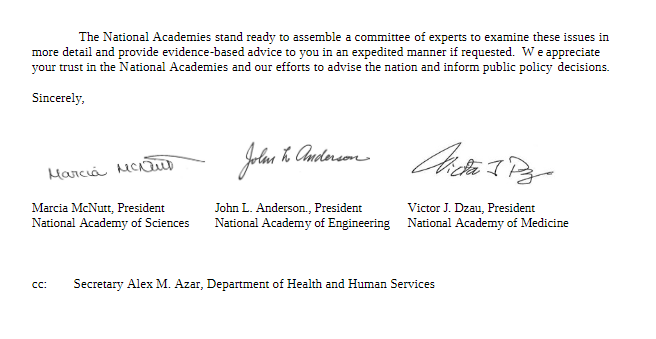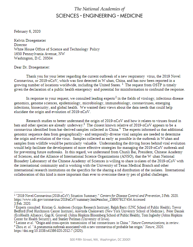 I’ve since been reminded that, although the first draft of the NASEM letter was anti-lab-origin, the final version actually sent to the White House (below) was neutral on the matter.